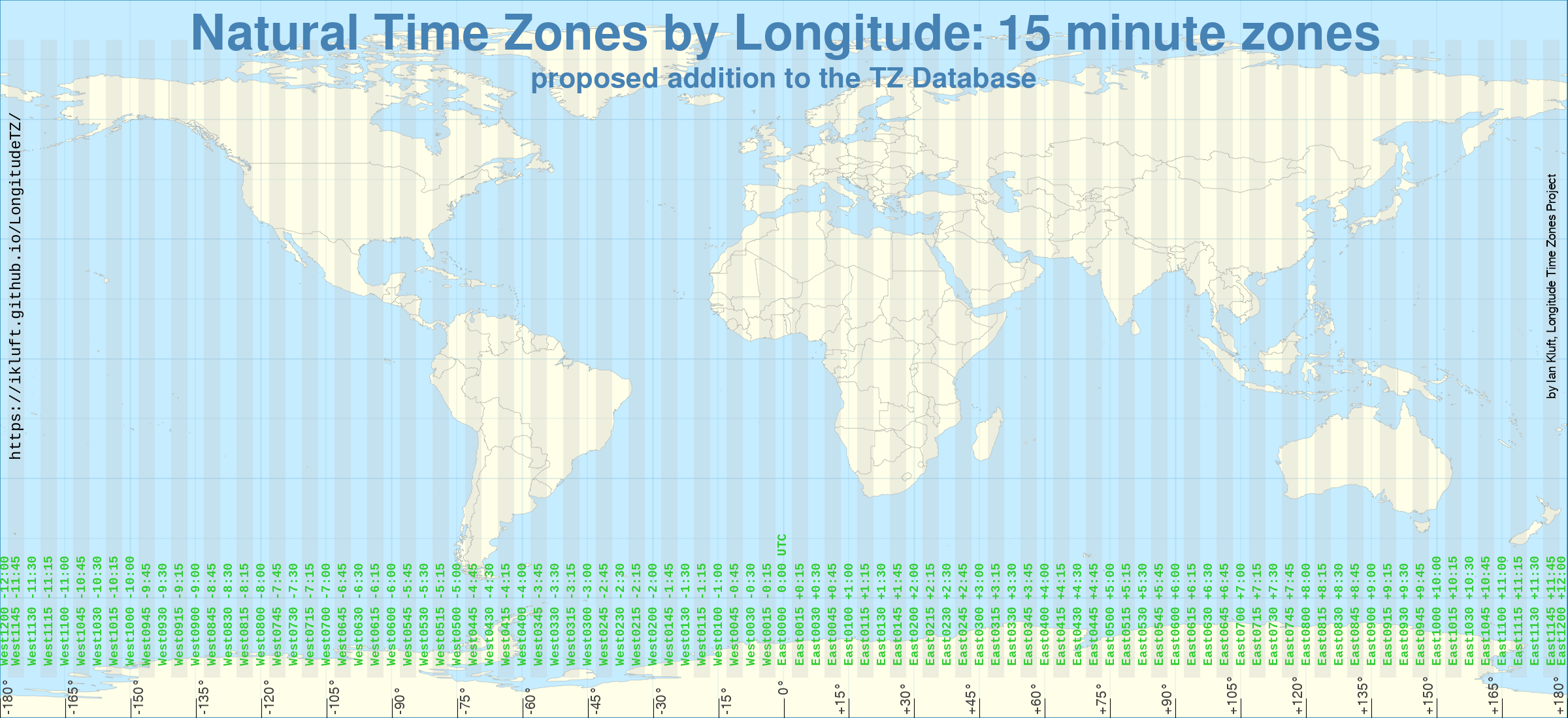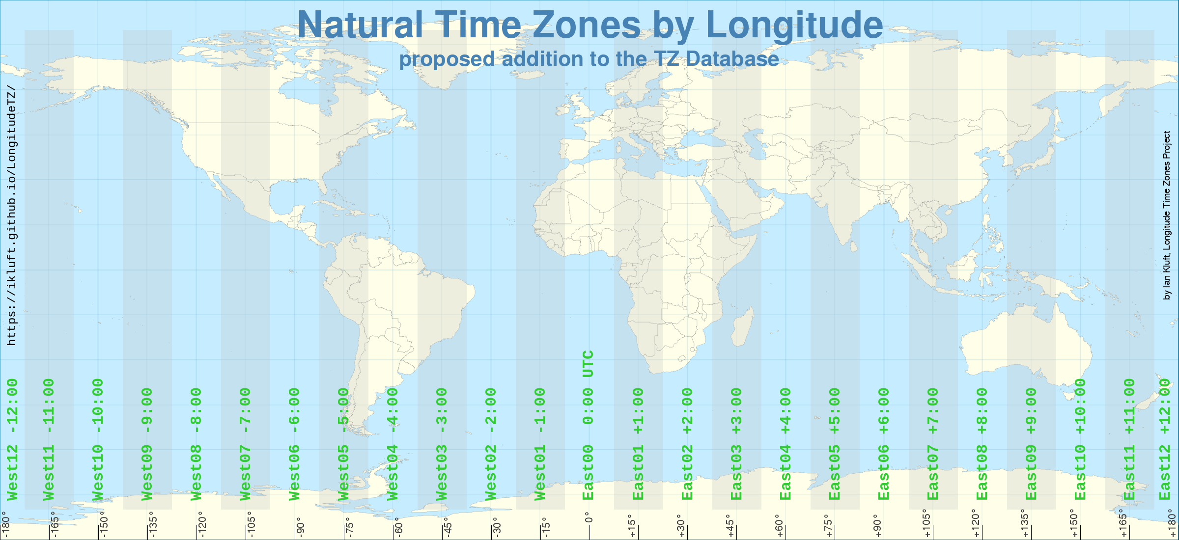 Note Dec 1, 2025: the LongitudeTZ project is overhauling the narrow overlay time zones from 1-degree longitude (4 minutes clock time) to 3.75 degrees longitude (15 minutes clock time). There are no changes to the primary hour-wide time zones.